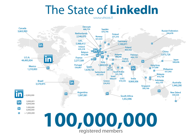 - Linkedin用戶超過(guò)1億,其中44%來(lái)自美國(guó)當(dāng)?shù)兀?6%來(lái)自其他國(guó)家,每12天能增加100萬(wàn)用戶