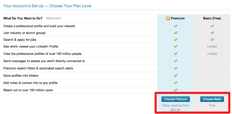 在你注冊(cè)完賬戶之后,你會(huì)發(fā)現(xiàn)Linkedin有兩種會(huì)員模式,一種是付費(fèi)的一種是免費(fèi)的,其中最大的區(qū)別也是最有用的區(qū)別就是付費(fèi)的版本你可以發(fā)信息給不在你好友圈子里的用戶,當(dāng)你熟悉了怎么使用Linkedin之后,可以根據(jù)自己的實(shí)際情況來(lái)看是否要加入付費(fèi)會(huì)員。