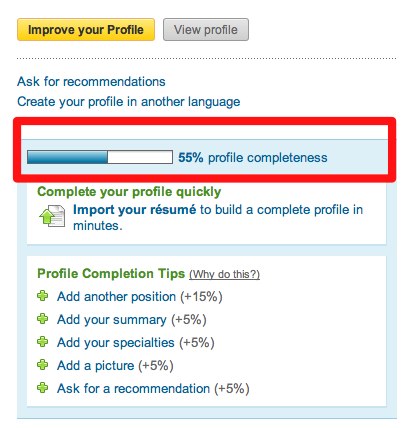 Linkedin為了保證用戶的高質(zhì)量,所以在注冊(cè)成功之后,會(huì)要求你填寫(xiě)一些你的相關(guān)資料,其中最難完成的就是需要有人給你寫(xiě)些評(píng)語(yǔ)進(jìn)行推薦,你需要三個(gè)會(huì)員給你寫(xiě)評(píng)論和推薦才算100%完成你的資料填寫(xiě),當(dāng)然完成之后也會(huì)帶來(lái)更多的人加你。相信很多外貿(mào)SOHO一開(kāi)始都不會(huì)有評(píng)價(jià),那么想獲得別人的推薦的唯一方法就是你先去主動(dòng)給別人寫(xiě)評(píng)論了,直到有人給你寫(xiě)了為止。
