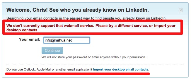 接下來(lái)一步很重要的事情,對(duì)于做外貿(mào)的人來(lái)說(shuō),你必須同步你平時(shí)和客戶溝通的郵箱,Linkedin會(huì)自動(dòng)檢查所有和你交流過(guò)的人是否有注冊(cè)過(guò)Linkedin,如果你已經(jīng)做外貿(mào)很多年了,必然有很多有用的聯(lián)系人,借這個(gè)機(jī)會(huì)把他們都加入關(guān)系網(wǎng),一定會(huì)給你增加更多的機(jī)會(huì)。導(dǎo)入郵件的時(shí)候需要注意如果你用的不是常見(jiàn)郵箱如Gmail, MSN, AOL等,則需要通過(guò)導(dǎo)入文件的方式才可以進(jìn)行。