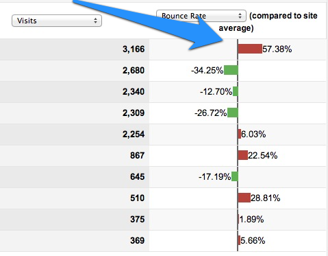 上圖中,中間的軸就是網(wǎng)站的平均跳出率, 紅色代表的是高過平均值,綠色是低過平均值。所以紅色不好,綠色好。和美國股市一樣的。如果你仔細(xì)看會發(fā)現(xiàn)推送流量最多的網(wǎng)站也就是第一個,在一個月內(nèi)輸送了3166個Ip,聽起來不錯吧?但是他的跳出率比平均值高出57.38% 。很明顯這個流量不給力,如果你做了轉(zhuǎn)換率設(shè)置,你也可以看出這個流量的轉(zhuǎn)換率一定也是很低的。