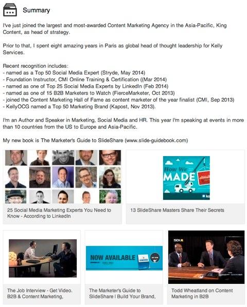 Todds用新書(shū)封面、PPT幻燈片、文章鏈接、個(gè)人演講視頻這些視覺(jué)元素美化自己的個(gè)人資料,看起來(lái)富有創(chuàng)造力,很容易獲得好的第一印象。視覺(jué)內(nèi)容最好保持定期更新,展現(xiàn)自己的一種積極態(tài)度,一來(lái)是獲得更好的視覺(jué)元素,另一方面也避免了給人留下一種做作的感覺(jué)。特別是一些獲獎(jiǎng)或者表彰類(lèi)的視覺(jué)性資料,能讓你的資料更充實(shí),個(gè)人形象更生動(dòng)。