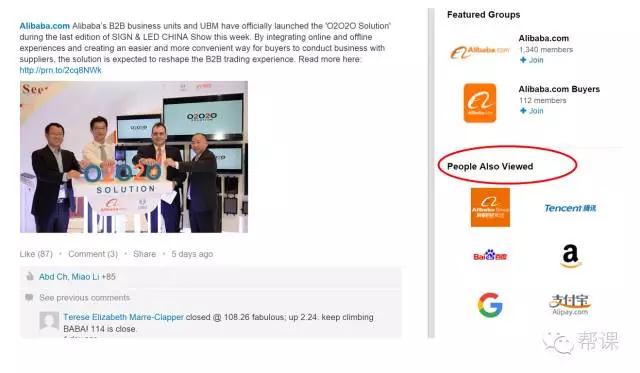 (2)潛在客戶來(lái)到了你同行的Company Page, 你不會(huì)出現(xiàn) (反之,哈哈,如果你做了Company Page, 就算客戶直接來(lái)到了你競(jìng)爭(zhēng)對(duì)手或同行的Company Page, 你也很有可能會(huì)被推送到你潛在客戶的面前,一個(gè)簡(jiǎn)單的“People Also Viewed", 用處大著呢!
