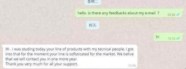 誰知道他直接給了來了上面一段話,意思是我們的產(chǎn)品暫時不適合他的市場,一年之后再聯(lián)系你。