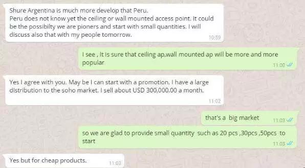 雖然跟進了幾個月,但是跟這個客戶之間來往的郵件并不多,大部分都是在whatsapp上溝通的,不得不說這是一個好東西啊。由于時差的原因,每次都是我這邊大清早,他那邊晚上的時候才能溝通一下,時間很短,偶爾遇到他熬夜,就能多聊一下,但是沒有實質(zhì)性的進展。