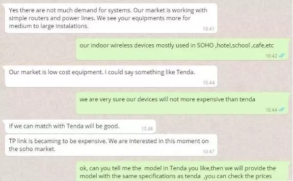 客戶還說TP-link的貴,tenda的不錯。正好,我們的價格絕對比他們便宜,質(zhì)量不會差,乘機問問他喜歡tenda的什么型號,來對比下我的,推薦我們的給他。